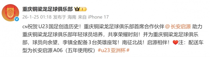重庆铜梁龙官方社媒表示:祝贺U23国足创造历史!长安启源为重庆铜梁龙足球俱乐部,球员向余望、李镇全配备3台英雄座驾!南征北战!启源相伴!注:配送车型为长安启源A06(五年使用权)
